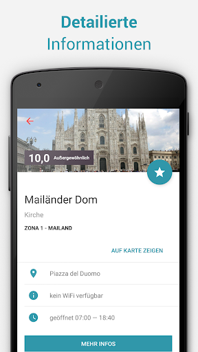 Sie haben alle Informationen offline und frei verfügbar immer mit dabei. Für jede Destination umfangreiche und aktuelle Informationen von tausenden Orten, Sehenswürdigkeiten und Points of Interest und viele Möglichkeiten Hotels direkt in Ihrem Mailand Reiseführer zu buchen.