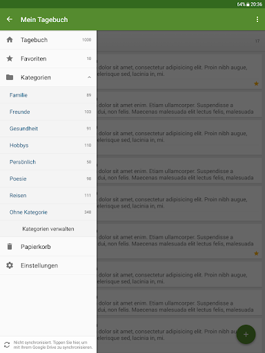- Synchronisieren Sie Ihre Tagebucheinträge über Google Drive zwischen allen Android-Geräten, die Sie verwenden