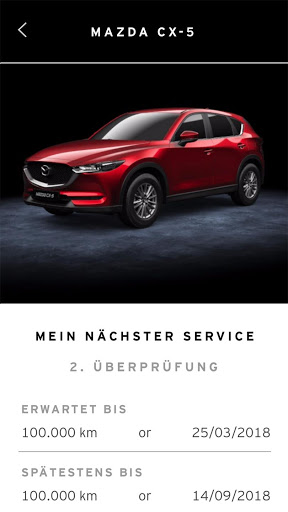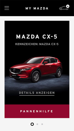 Sie erhalten über die App Erinnerungen zu fälligen Wartungen und anstehenden Verschleißreparaturen an Ihrem Mazda. Die Pannenhilfe von Mazda Europe Service können Sie direkt aus der App heraus anrufen.