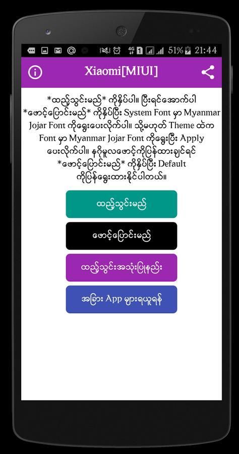 Xiaomi ဆိုရင္ေတာ့ "ထည့္သြင္းမည္" ကိုႏွိပ္ၿပီး "ေဖာင့္ေျပာင္းမည္" ကိုႏွိပ္ၿပီး System Font သို႔မဟုတ္ Theme ထဲက Font ထဲမွာ
