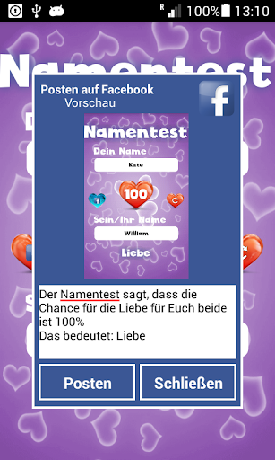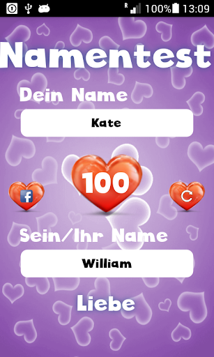 Gib deinen Namen und den Namen der Person die du liebst ein. Der Test berechnet den Prozentsatz und testet eure Liebe, indem er eure Namen vergleicht und die Übereinstimmung eures persönlichen Paares berechnen. (*1)