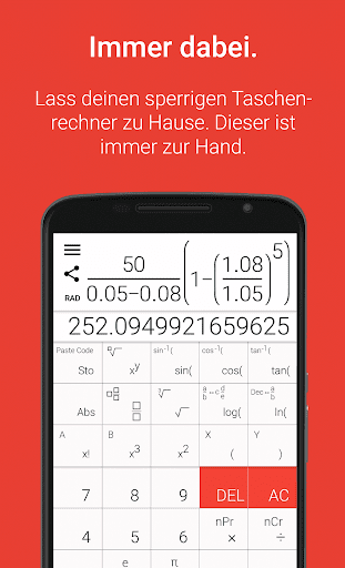 In anderen Apps musst du alles in eine einzige Zeile schreiben, wie in den 1970ern. Durch unsere natürliche Eingabe kannst du Rechnungen wie auf dem Papier eingeben, mit Brüchen, Wurzeln, Exponenten und mehr. Dies nennt sich „natürliche Darstellung“ und ist eine verbreitete Funktion wissenschaftlicher Rechner und jetzt gibt es das endlich auch auf Android!