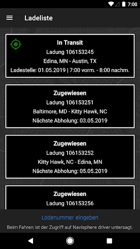 Navisphere® Driver ist kostenlos erhältlich. Diese App ist ein ausgezeichneter Weg, der dem Fahrer ermölicht, eine klare Übersicht über den Ablauf des C.H. Robinsons Transportsauftrag beinahe in Echtzeit zu übermitteln. Da die App automatisch eine Verbindung mit unserer Navisphere-Technologieplattform herstellt, werden Zeit und Kosten für die Durchführung erforderlicher Updates über den Ablauf des Transports eingespart. Sie können auch Papierdokumente durch die App direkt von Ihrem Smartphone einscannen und absenden, um den Zahlungsprozess sofort zu starten.