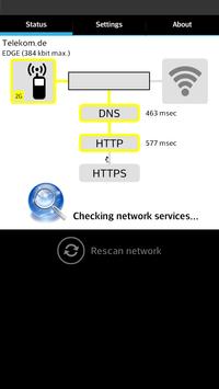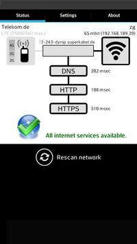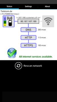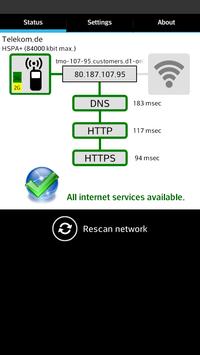 Net Check prüft, ob und wie du mit dem Internet Verbunden bist. Dafür werden alle essentiellen Internet-Dienste (DNS, HTTP und HTTPS) einzelnd angesprochen und getestet. Es gibt Situationen in denen man nicht sicher sein kann, ob eine internetfähige Verbindung besteht (Falsche APN, Hotels, Firmen, Wi-Fi Hotspots, usw.). Net Check hilft ihnen festzustellen ob definitiv eine Verbindung zum Internet gegeben ist und zeigt mögliche Probleme und Lösungen an.