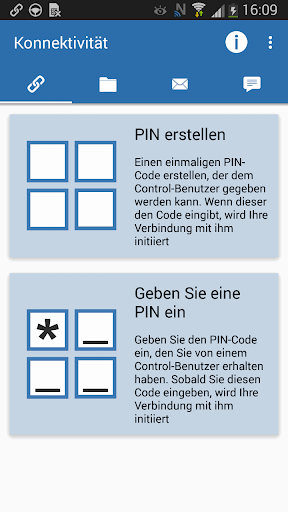 - Chat: Sowohl Client als auch Control können eine 1:1 Textchat-Sitzung initiieren. Außerdem kann der Client an Gruppendiskussionen teilnehmen, die vom Control initiiert worden sind.