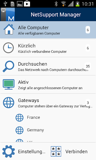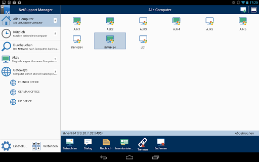 Das neue mobile Control ermöglicht dem Benutzer schnelle Suche und Verbindung, sowohl mit lokalen Computern nach IP-Adresse oder PC-Name als auch Durchsuchen, Verbinden mit und Ansicht von entfernten Computern mit Hilfe der kostenlosen NetSupport Manager Internet Gateway Komponente.