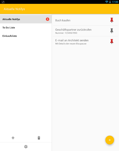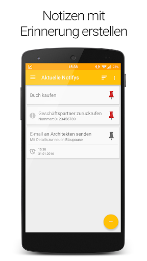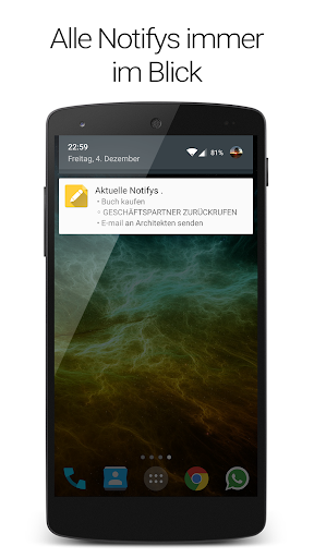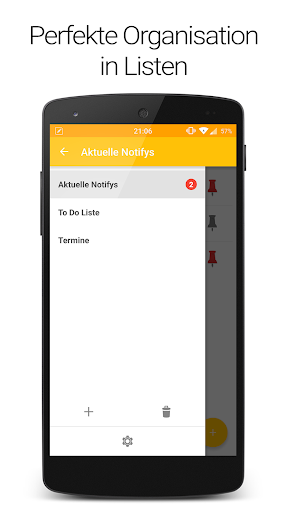 Um ihre Notizen zu verwalten, können Sie einfach eine neue Liste anlegen und Notifys zu ihr hinzufügen. Die Notifys können an die Benachrichtigungsleiste gepinnt werden und erinnern Sie immer an Ihre Aufgaben.