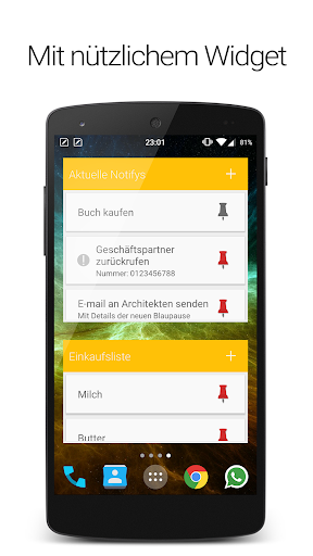 - Einfache Notizblock Funktion mit zusätzlicher Benachrichtigung, damit Sie ihre Aufgaben immer im Blick haben und nichts mehr vergessen