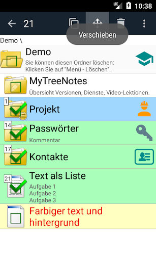 Notizen können einzeln kopiert, verschoben oder gelöscht werden. Außerdem können ausgewählte Elemente oder ganze Zweige mit allen untergeordneten Notizen verwendet werden.