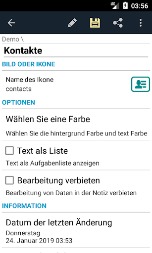 3. Fügen Sie für "Text als Liste" neue Optionen zu den "Einstellungen der Notiz" hinzu: "Sortierung", "Datum der letzten Änderung".