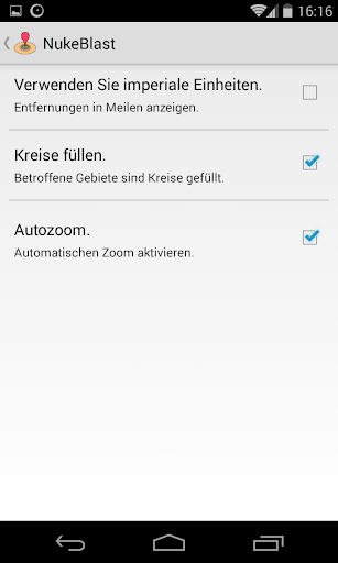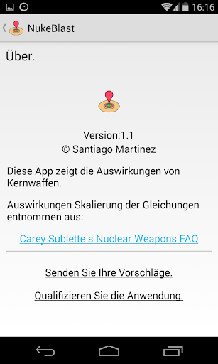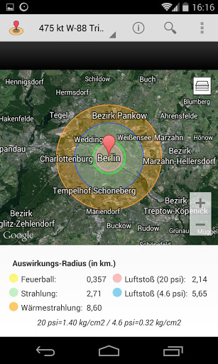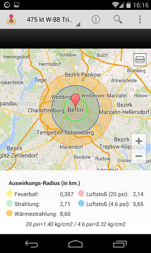 Möchten Sie den Effekt einer nuklearen Explosion auf Ihrer Heimatstadt wissen ? Mit dieser App können Sie herausfinden , wie viel Schaden ein Atomschlag verursachen würde . Zeigt das Ausmaß der Zerstörung und betroffene Gebiet , die verursacht würden, wenn die Bombe wurde von einem ebenerdigen Detonation fallen gelassen werden.
