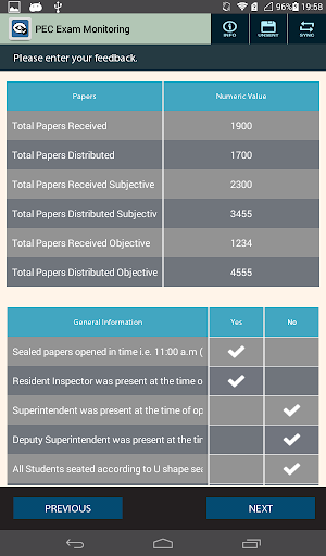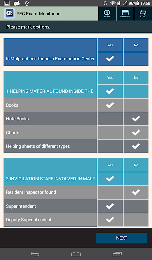The purpose of the application is to monitor the examination centers whether there are any malpractices during the exam. Its a form based activity, where user has to select yes/no against different questions and then send the form alongwith pictures.