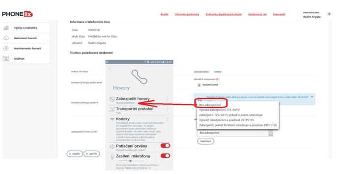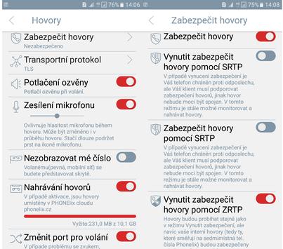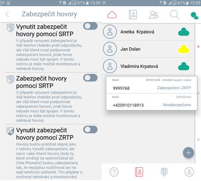 • SRTP encryption takes place between mobile clients and telephone exchange. Calls with SRTP can be automatically recorded or overwritten to text on www.phonelix.cz. This encryption is free charged.