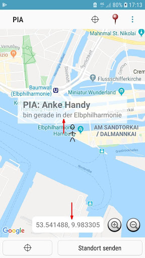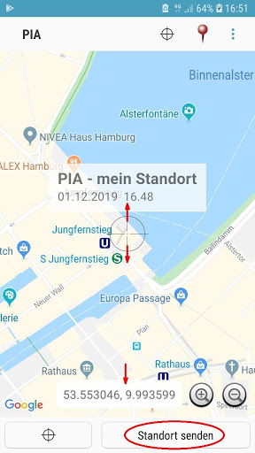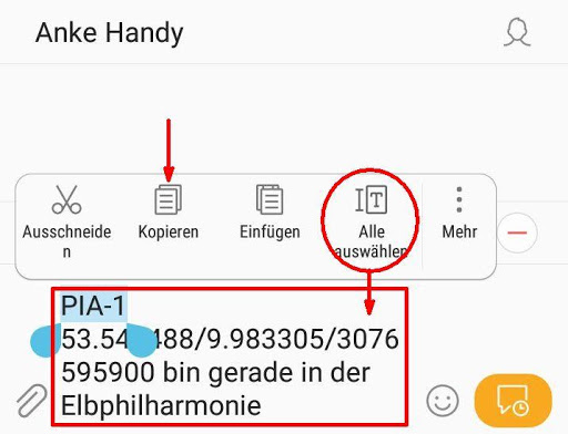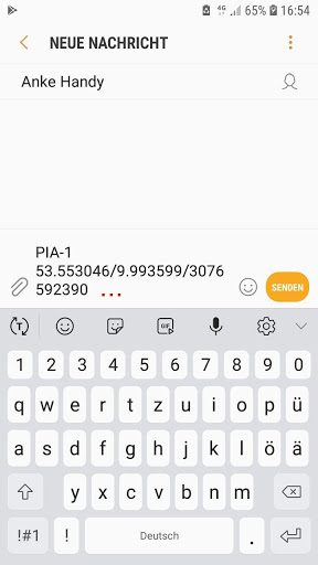 o Beim Senden: PIA-Standortdaten stehen am Anfang, eigener Text kann danach ergänzt werden