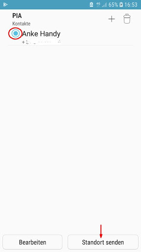 o Standort senden: PIA-Kontakt (mit Telefonnummer) auswählen