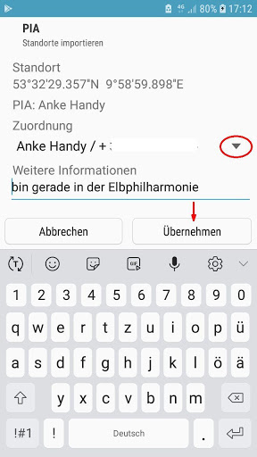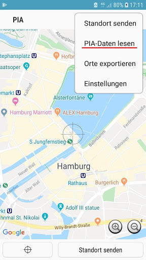 Wenn Standorte (als PIA-Daten) über eine Nachrichten-App empfangen werden, können sie von PIA importiert und auf der Karte genauso angezeigt werden, wie der eigene Standort.