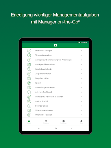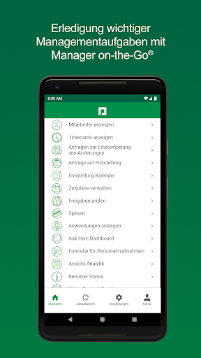 Da die Abwesenheit eines Vorgesetzten die Arbeit nicht unterbrochen sollte, hilft Manager on-the-Go Vorgesetzten ihren Arbeitstag bestmöglich zu nutzen. Dieses mobile Tool ermöglicht es Managern und Vorgesetzten, wichtige Personalaufgaben von überall aus zu erledigen, einschließlich der Genehmigung von Arbeitsstunden, Urlaubsanträgen und Spesenrechnungen. Sie können hier auch die Zeitplänen ihrer Teammitgliedern einsehen und vieles mehr.
