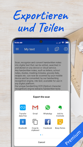 Führen Sie ein Upgrade auf einen Premium-Plan durch, um Ihren Text zu bearbeiten, in Dateien zu speichern, zu kopieren, per E-Mail (an sich selbst oder an andere) zu versenden, zu Notizen hinzuzufügen oder über auf Ihrem Gerät verfügbare Messaging-Apps zu teilen. Wir empfehlen, die Handschrifterkennung zunächst kostenlos auszuprobieren und erst dann einen Premium-Plan zu erwerben, nachdem die Qualität der Ergebnisse bewertet wurde, die die App bei der Umwandlung von Handschrift in Text liefert.
