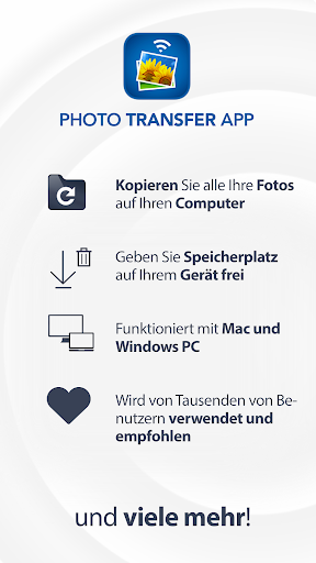 Mit der Photo Transfer App können Sie Fotos und Videos einfach von Ihrem Android-Gerät auf Ihren Computer übertragen, sie freigeben und sichern sowie Fotos von und zu einem anderen Android, iPhone oder iPad über Ihr WLAN-Netzwerk austauschen.