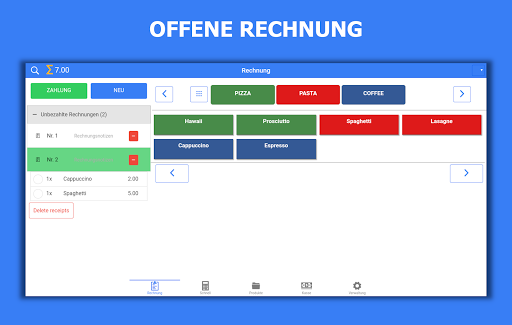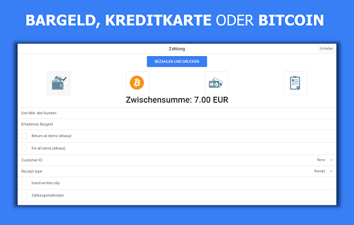 Anwendungen funktioniert auf Android 4.1 und höher, Bluetooth-Drucker muss in den Geräteeinstellungen geknüpft werden und danach in den Programmeinstellungen eingestellt werden.