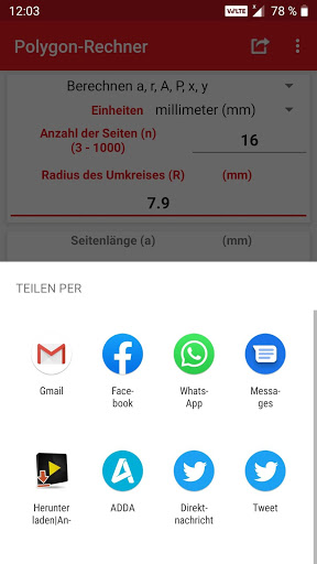 Berechnete Werte und Ergebnisse können für soziale Medien, E-Mails, Nachrichten und andere freigegebene Apps freigegeben werden.