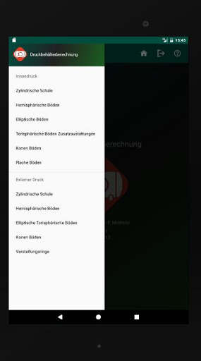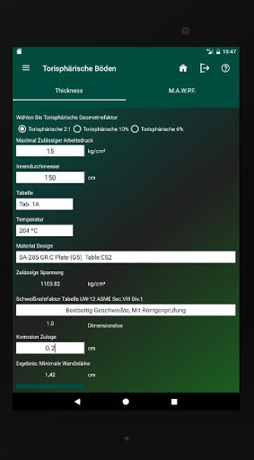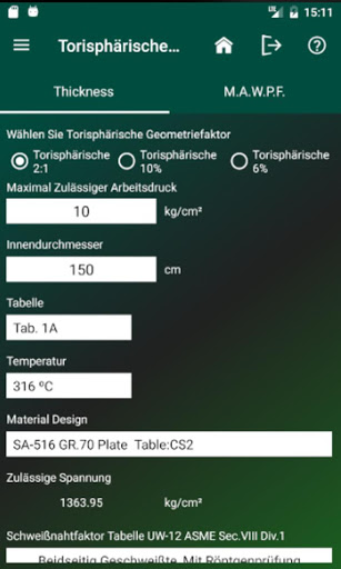 Es ist möglich, den maximal zulässigen Betriebsdruck in Abhängigkeit von der erforderlichen Mindestdicke zu berechnen oder eine umgekehrte Prüfung durchzuführen.
