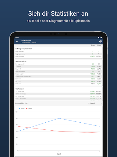 Sieh dir umfangreiche Statistiken zu deinen Dartspielen an. Für alle Spielmodis existieren viele Statistiken, die du sowohl als Tabelle als auch als Diagramm anschauen kannst. Um nicht den Überblick zu verlieren kannst du auswählen welche Statistiken du sehen möchtest und welche nicht.