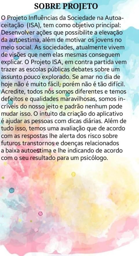 O projeto influência da Sociedade na Autoaceitação (ISA), tem como objetivo principal: Desenvolver ações que possibilite a elevação da autoestima, além de motivar os jovens no meio social. As sociedades, atualmente vivem de visões que nem elas mesmas conseguem explicar. O Projeto ISA, em contra partida vem trazer as escolas públicas debater sobre um assunto pouco explorado. Se amar no dia de hoje não é muito fácil, porém não é tão difícil. Acredite, todos nós somos diferentes e temos defeitos e qualidades maravilhosas, somos incríveis do nosso jeito e padrão nenhum pode mudar isso. O intuito da criação do aplicativo é ajudar as pessoas com dicas diárias. Além de tudo isso, temos uma avaliação que de acordo com as respostas lhe alerta dos risco sobre futuros transtornos e doenças relacionados a baixa autoestima e lhe indicando de acordo com o seu resultado para um psicólogo.