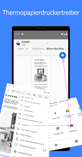 Suchen Sie in einer App nach den Menüpunkten "Drucken", "Freigeben", "Senden" oder "Öffnen". Klicken Sie auf und wählen Sie RawBT.