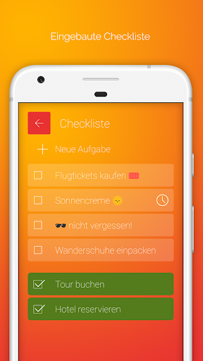 Überprüfe die Temperatur- und Wetteranzeige, um Wettergemäß zu packen. Vergesse nichts, dank der integrierten Reise-Checkliste. Verwende Aufgabenerinnerungen, um deine Aufgaben rechtzeitig zu erledigen.