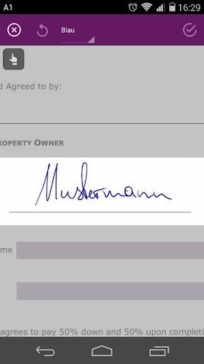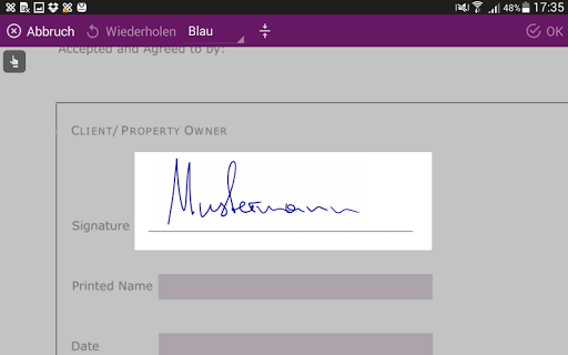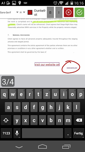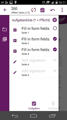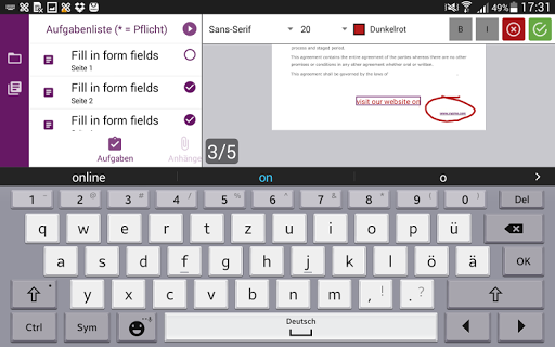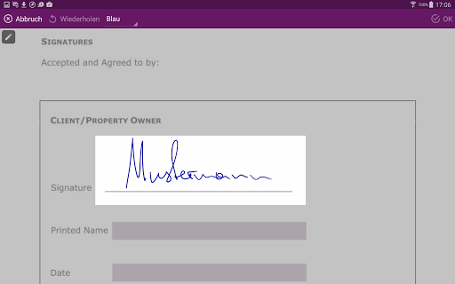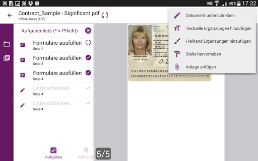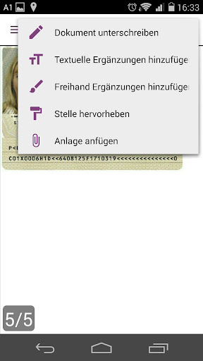 Zum Unterschreiben klicken Sie auf das Stiftsymbol in der Menüleiste, positionieren das Unterschriftsfeld beliebig am Dokument und unterschreiben auf dem Gerät. Die Unterschrift erscheint unmittelbar im elektronischen Dokument. Weiters können Sie Texte über den Textmarker (z.B. Name, Ort, Datum, ...) zusätzlich ergänzen und Fotos via Kamera oder Fotoalbum (z.B. eine Ausweiskopie oder ein Foto) an ein Dokument anhängen.
