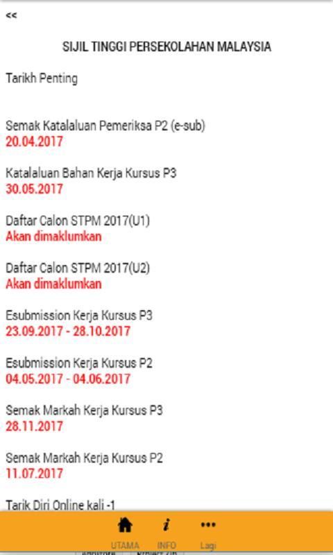 Aplikasi ini adalah untuk kegunaan Setiausaha Peperiksaan (SUP) STPM bagi memudahkan SUP untuk memantau tarikh-tarikh penting sepanjang tahun berkaitan, maklumat berkaitan E-submission dan maklumat-maklumat kerja kursus bagi peperiksaan STPM.