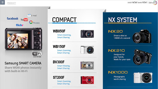 Shoot the Wow, Share it NowCapture the moment and share the experience with the Samsung Smart Camera AppThe Samsung Smart Camera Application allows you to see feature descriptions, usage information pictures, and videos from your wifi equipped smart camera. With the app, you can save, edit, and share pictures and videos conveniently. You can also see specifications of Samsung smart cameras including the NX series mirrorless cameras NX20, NX210, and NX1000 and other smart camera models WB850F, ST200F, and DV 300F. With the 3D Virtual Reality feature, you can rotate the camera image 360 to see every detail.Samsung Smart Camera App FeaturesFeature descriptions and specifications A guidebook of shooting tips and usage scenariosA gallery of sample pictures and videosA 3D, virtual reality environment for exploring smart camera modelsNote:This application is designed exclusively for the Galaxy Tab 2 10.1quot;. The file size is quite large, so download it via WiFi to avoid high data feesTag : , , smart camera, samsung smart camera, SAMSUNG Smart camera NX, NX20, NX1000, NX210, NX200, NX10