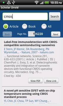 Scholar Droid is a free application that lets you conveniently browse through search results returned by Google Scholar, look up book results on Amazon, add/export/import bookmarks, view/save free PDF articles to SD card and send search result links as email.