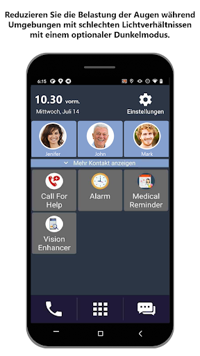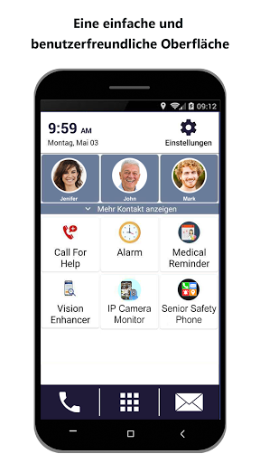 Verleihen Sie Ihrem Smartphone ein völlig neues Aussehen. Große Knöpfe für ältere Hände. Single-Touch-Zugriff auf die am häufigsten angerufenen Kontakte. Alle Grundlagen zum Tätigen von Anrufen, Empfangen und Senden von Textnachrichten sind einfach stressfrei .