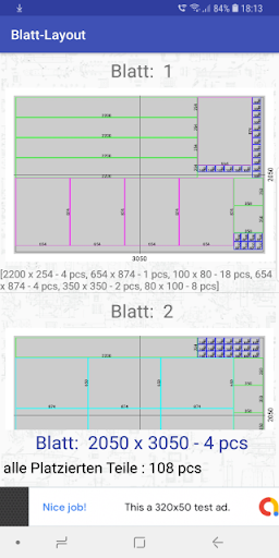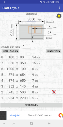 Anzahl rechteckiger Teile erforderlich sind, und zeigt die Verschachtelungskarte.