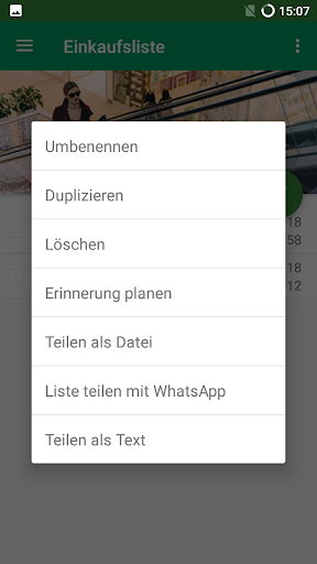 - Eine Einkaufsliste kann umbenannt werden, dupliziert, gelöscht werden und geteilt werden.