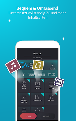 Teilen Sie intuitiv alle Ihre persönlichen Daten mit dem neuen Telefon. Diese mobile App zum Senden großer Dateien bietet eine außergewöhnliche Unterstützung für Android-Übertragung und iOS-Übertragung. Es kopiert schnell alle Daten und dient als beste Dateiübertragungs-App, Kontaktübertragungs-App, Foto-Sharing-App, Messenger-Migrator und Video-Sharing-App. Es ist ein effizientes Datenmanagement-Tool, mit dem Sie große Dateien senden und Kontakte von Android zu iPhone und alle Ihre alten mobilen Daten zu neuen Handys übertragen können, ohne dass dabei der Datenschutz verloren geht.