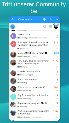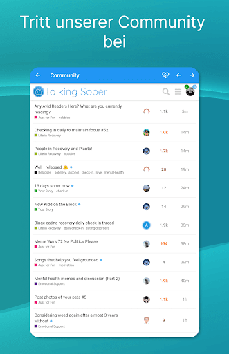 Hol dir Hilfe bei deiner Sucht: Sober Time hat eine eigene Community, in der du über alles lesen und diskutieren kannst, was mit Nüchternheit zu tun hat: vom Trinken bis zur Selbstverletzung. Lies die Geschichten anderer, stelle Fragen, teile deinen Nüchternheitstracker oder diskutiere über das Leben in der Genesung. Tausende Mitglieder geben dir wertvolle Tipps, wie du mit dem Trinken aufhören und dich von Selbstverletzungen erholen kannst.