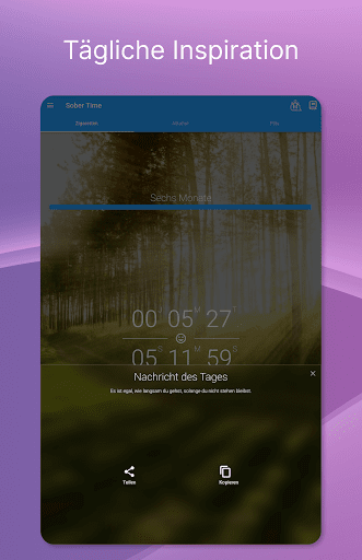 Beginne deine Reise in die Nüchternheit oder setze sie fort: Der Nüchterne-Tage-Zähler von Sober Time hilft Tausenden von Abhängigen, sich von schweren Süchten wie Drogenabhängigkeit, Alkoholismus, Rauchen oder Selbstverletzung zu erholen.