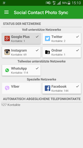 Synchronisiere deine Telefonkontakte mit hochauflösenden Fotos von sozialen Netzwerken und teilweise auch von sozialen Apps: