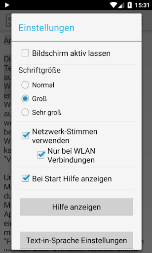 Unter dem Menüeintrag "Einstellungen" befinden sich Optionen wie Anpassen der Schrittgröße, Bildschirm aktiv lassen, Benutzen von qualitativ hochwertigen Netzwerk-Stimmen wie sie beispielsweise vom Google Text-in-Sprache Modul unterstütz wird. Von dort gelangen Sie auch zu den Text-in-Sprache Einstellungen um beispielsweise neue Sprachen oder Stimmen zu installieren, Sie können diese Hilfeanleitung erneut anzeigen lassen oder können für zusätzliche Informationen, Feedback oder Unterstützung zu unserer Homepage gelangen.