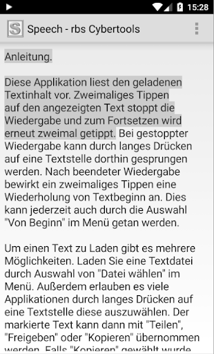 Diese Applikation liest den geladenen Textinhalt vor. Zweimaliges Tippen auf den angezeigten Text stoppt die Wiedergabe und zum Fortsetzen wird erneut zweimal getippt. Bei gestoppter Wiedergabe kann durch langes Drücken auf eine Textstelle dorthin gesprungen werden. Nach beendeter Wiedergabe bewirkt ein zweimaliges Tippen eine Wiederholung von Textbeginn an. Dies kann jederzeit auch durch die Auswahl "Von Beginn" im Menü getan werden.