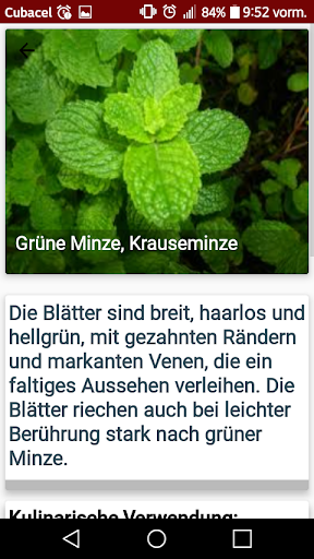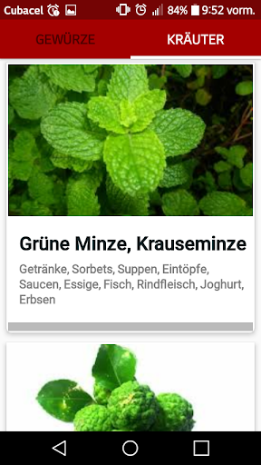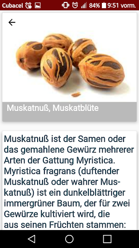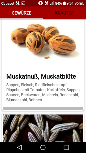 Gewürze, Kräuter und ihre kulinarischen Verwendungen ist eine KOSTENLOSE Anwendung für Android, die eine Vielzahl von Gewürzen , deren Beschreibung und kulinarischen Verwendungen enthält zu den Arten von Lebensmitteln.