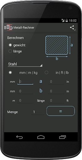 Dieser Rechner berechnet das Metall in den beiden Systemen der Messung. In das Metrische system (Millimeter, Meter, Kilogramm) und mess-system der USA (Zoll, Fuß).