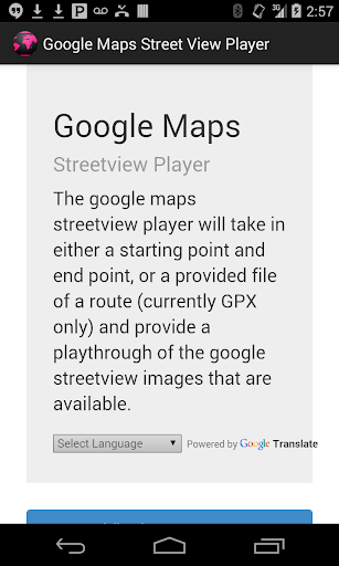 The google maps streetview player will take in either a starting point and end point, or a provided file of a route (currently GPX only) and provide a playthrough of the google streetview images that are available.