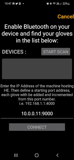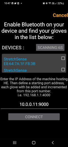 - Ermöglicht dem Benutzer, nach der Verbindung durch die Reihenfolge der Handschuhe zu wechseln.Für zwei Handschuhe kann ein Benutzer die Bestellung von links nach rechts austauschen. Wenn jedoch mehr als 2 Geräte mit einem Telefon angeschlossen sind (das wir nicht empfehlen), durchschreiten Sie nur durch (d. H. Für 3 Handschuhe die Handschuhe nachbestellen 1- & gt; 2,2- & gt; 3, 3- & gt; 1).https://get.stretchsense.com/knowledge/how-to-setup-a-wi-bridge-using-an-android-phone-doc-5030-preview-feature