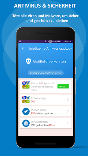 Antivirus für Android-Handys kostenlos ist einer der besten Antivirus-Free-Download-, Virus-Reiniger / kostenlose Anti-Malware-Entfernung, Sicherheits-Apps, die Spyware, Malware und Trojaner von Handys blockiert.