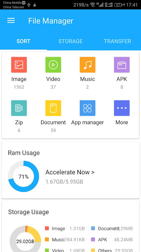 Super File Manager is a powerful Android file manager, clear classification allows you to quickly find pictures, videos, music, installation package, compressed package, documents and other documents, but also supports application management, memory cleanup, also supports mobile phone memory and SD card's global search, view details, rename, copy, delete, cut, share and other file operations.