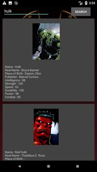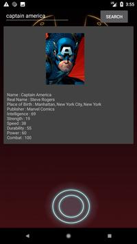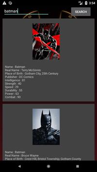 The app lists the profile of all superheroes which includes Publisher,Real name,Birth place,Strength,Power stats,Intelligence,Durability,Power,Combat......